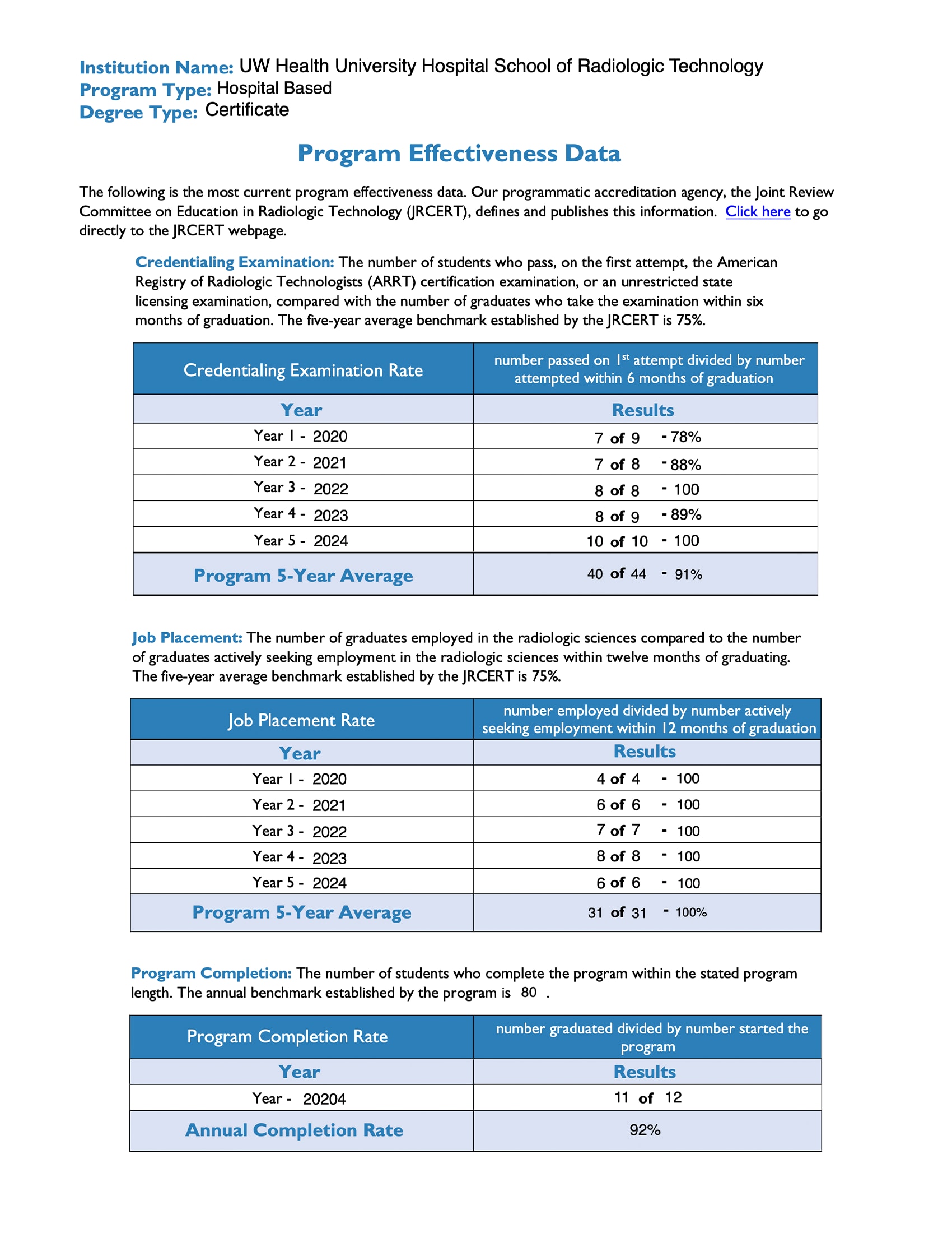 5. The school will monitor program effectiveness data (PED) consistent with JRCERT standards. | * Students will graduate from the program and become employed within 12 months of graduation. * The program completion rate will be greater than 80%. * The five-year average job placement rate within 12 months of graduation will be greater than 75%. * Graduates will exhibit a high degree of satisfaction with their education and pass the ARRT credentialing exam on the first attempt. * Annual post-graduate surveys will average greater than 3.5 on a 5.0 scale. * Five-year average pass rate for first attempt on the ARRT credentialing exam will be greater than 90%. * Employers will exhibit a high degree of satisfaction with the program. * Annual employer satisfaction surveys will average greater than 3.5 on a 5.0 scale. |